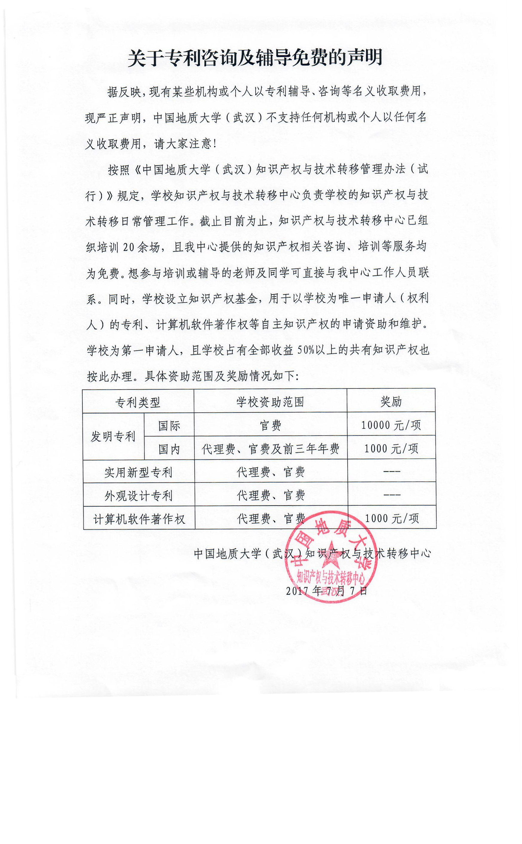 据反映,现有某些机构或个人打着进行专利辅导、咨询等名义收取费用,现严正声明,中国地质大学(武汉)不支持任何机构或个人以任何名义收取费用,请大家注意!